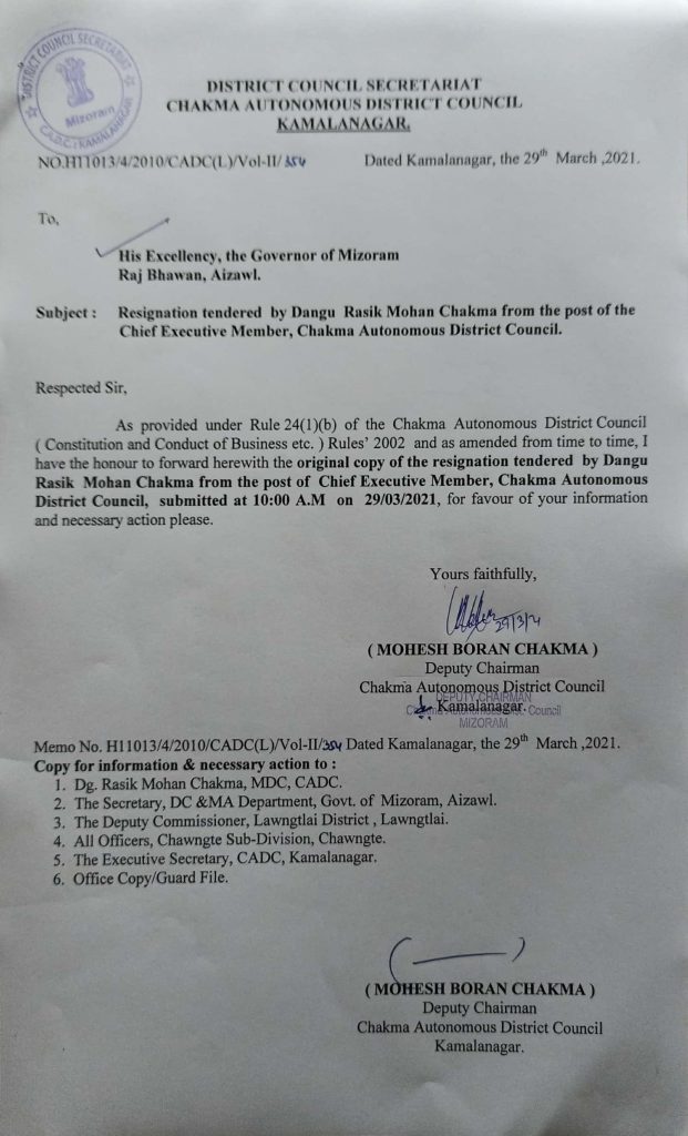 Dg. Durjya Dhan Chakma was appointed the new CEM by the Governor, Mizoram following the resignation tendered by Dg. Rasik Mohan Chakma from the post of CEM, CADC on 29th March, 2021. The resignation by Dg. Rasik Mohan Chakma came about with the removal of Dg. H. Amaresh Chakma from the post of Chairman in a no-confidence motion in the Budget Session, 2021-2022.