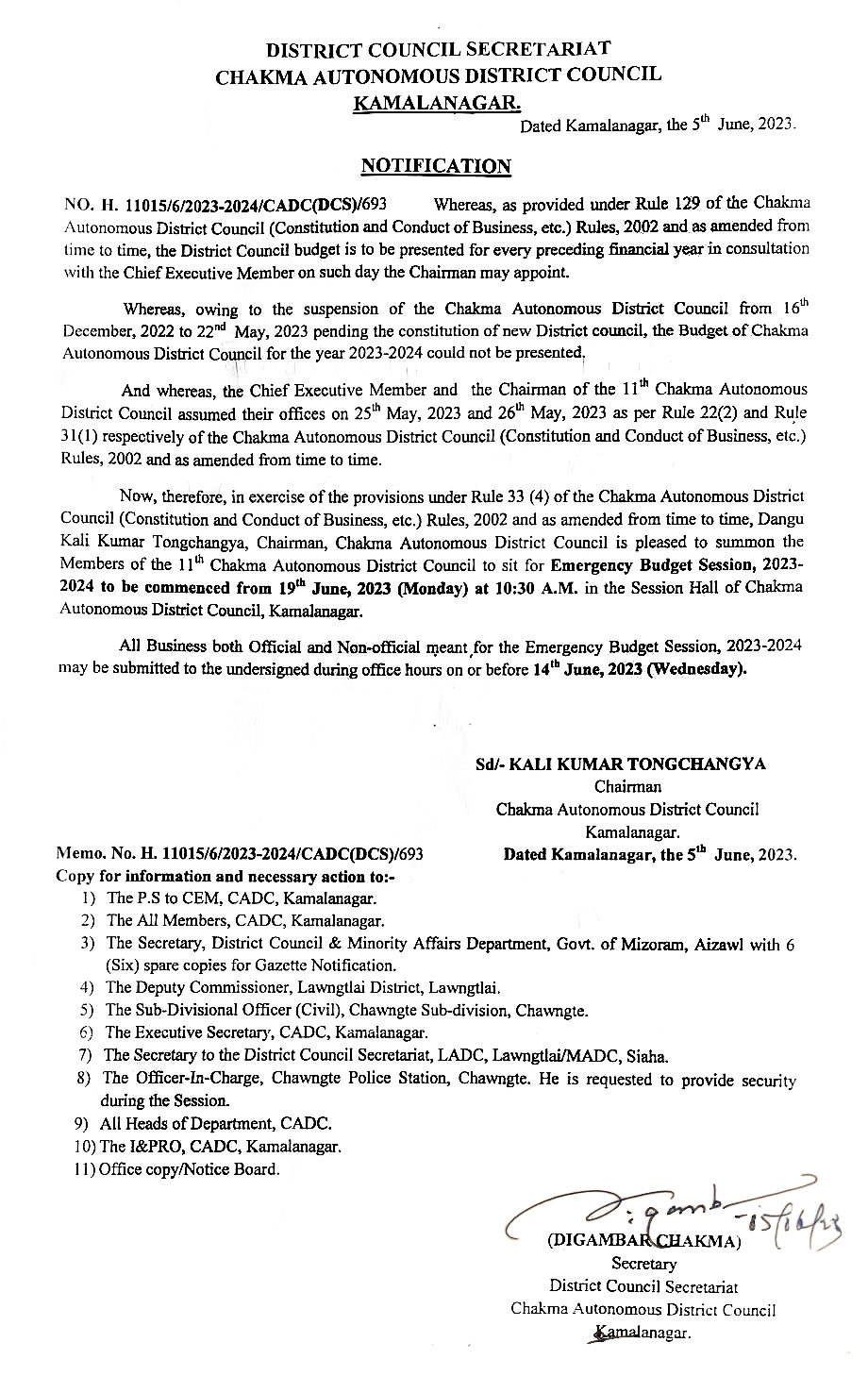 Dg. Kali Kumar Tongchangya, the Chairman of the Chakma Autonomous District Council is pleased to summon the Members of the 11th Chakma Autonomous District Council to sit for Emergency Budget Session, 2023-2024 to be commenced from 19th June, 2023 (Monday) at 10:30 A.M. in the Session Hall of CADC, Kamalanagar.