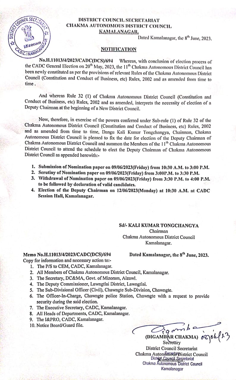 As provided by Rule 32(1) of Chakma Autonomous District Council (Constitution and Conduct of Business, etc.) Rules, 2002 and as amended from time to time, Dangu Kali Kumar Tongchangya, the Chairman of Chakma Autonomous District Council is pleased to fix the date for election of the Deputy Chairman of the Chakma Autonomous District Council and summon the Members of the 11th Chakma Autonomous District Council to elect the Deputy Chairman of the Chakma Autonomous District Council as per schedule below: